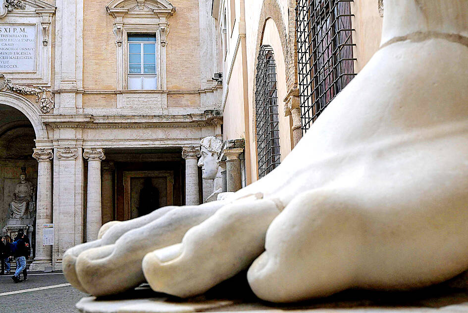 The result: An imposing figure of a seated emperor, draped in a gilded tunic and holding a scepter and orb, gazing over his Rome from a side garden of the Capitoline Museums. The reconstructed statue is just around the corner from the museum courtyard where the original fragments of Constantine’s giant feet, hands and head are prime tourist attractions.