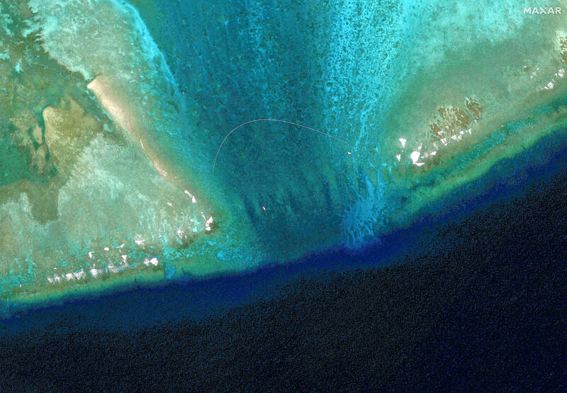 One of the images taken by Maxar Technologies on Thursday last week and viewed by Reuters showed the barrier blocking the mouth of the shoal, where the Chinese coast guard last week claimed to have driven off a Philippine vessel “illegally intruding” into Beijing’s waters.