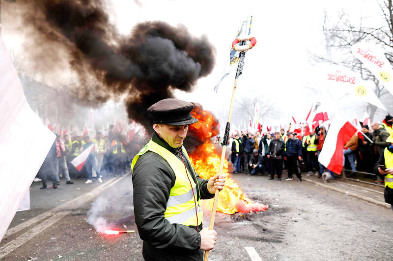 Farmers on tractors blocked highways leading into Warsaw while thousands of people gathered in front of the prime minister’s office before marching to the parliament.