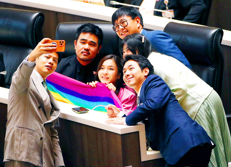 Move Forward Party lawmakers take a selfie to celebrate the passage of a marriage equality bill in the Thai House of Representatives in Bangkok yesterday.
