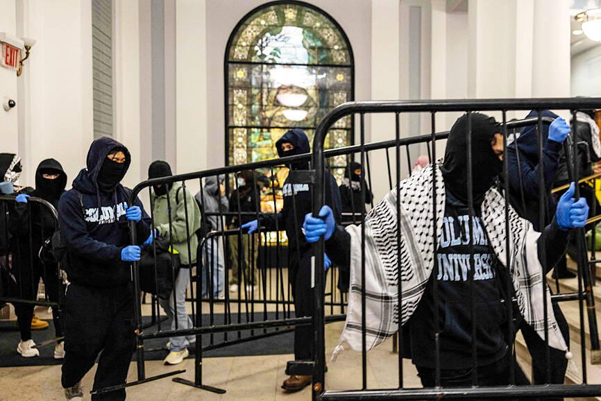 Dozens of protesters took over a building at Columbia University (CU) in New York early yesterday, barricading the entrances and unfurling a Palestinian flag out of a window in the latest escalation of demonstrations against the Israel-Hamas war that have spread to college campuses nationwide.