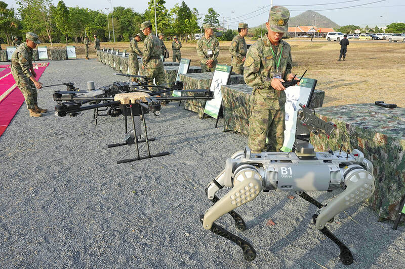 China’s military yesterday showed off its machine-gun equipped robot battle “dogs” at the start of its biggest ever drills with Cambodian forces.