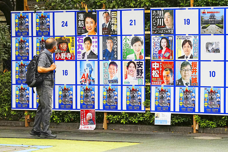 Tokyo is holding elections for a new governor tomorrow, but residents say personal publicity stunts have overtaken serious campaigning to a degree never seen before, with nearly nude women in suggestive poses, pets, an artificial intelligence (AI) character and a man practicing his golf swing.