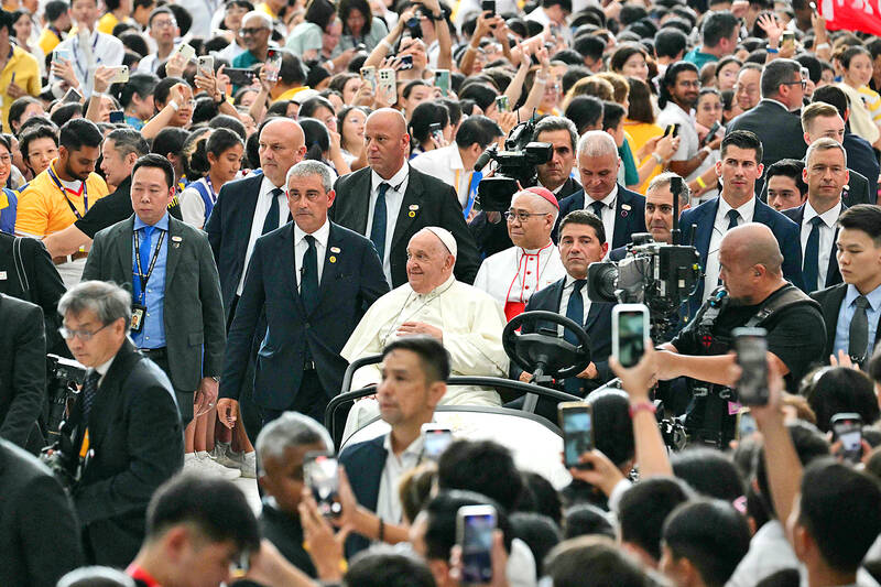 Francis’ speech came after private meetings with Singaporean President Tharman Shanmugaratnam and Singaporean Prime Minister Lawrence Wong (黃循財) at the country’s parliament building, where the pope was greeted with a formal honor guard and the playing of the Vatican anthem.