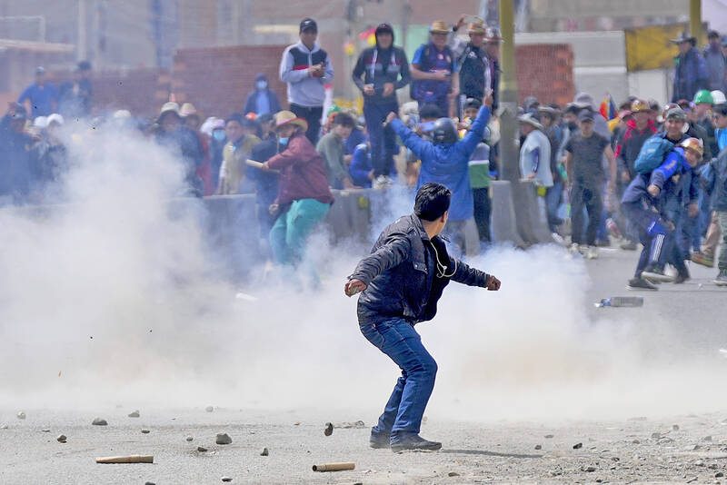 The protesters and counterprotesters hurled firecrackers, homemade explosives and stones at each other across a dusty sprawl in the city of El Alto, while riot police unleashed tear gas into the crowds. At least eight people were injured, the Bolivian Ministry of Health said.
