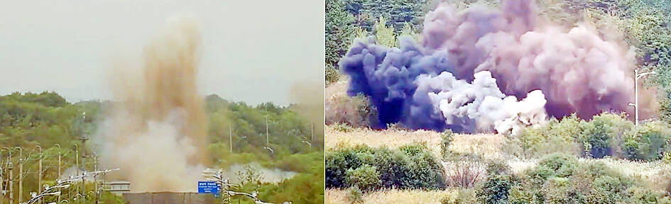 North Korea blew up sections of roads in its own territory that are part of links once used to connect the southern part of the peninsula with the north, in a show of defiance after it accused Seoul of flying drones over Pyongyang.