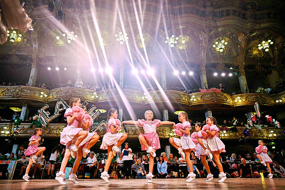 Rain might be falling outside on the promenade in the English seaside resort of Blackpool, but the inside of the Tower Ballroom — billed as “the UK’s most spectacular” — is bathed in light, sequins, pompoms and music.