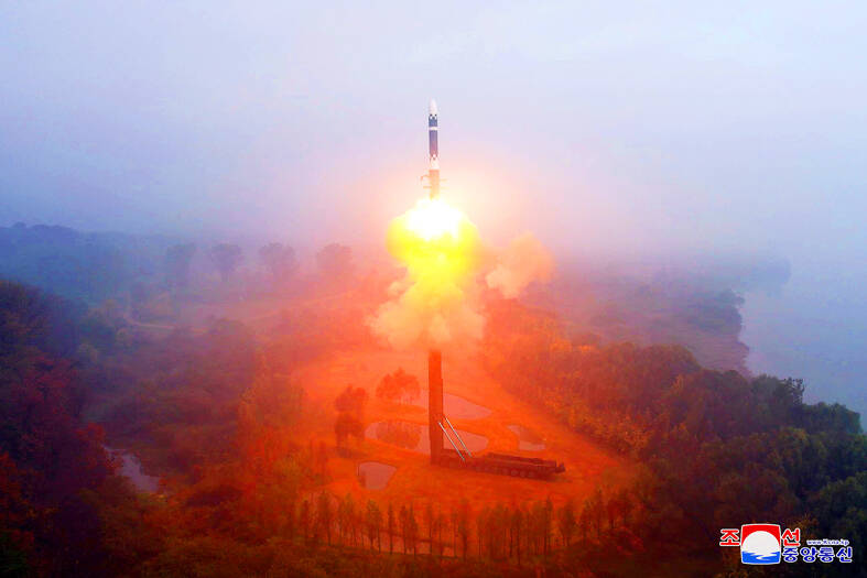 Pyongyang yesterday said that a new intercontinental ballistic missile (ICBM) it test-launched is “the world’s strongest,” while experts said that it is too big to be useful in a war situation. The ICBM launched on Thursday flew higher and for a longer duration than any other weapon the nation has tested, but foreign experts say the test failed to show that Pyongyang has mastered some of the last remaining technological hurdles to possess functioning ICBMs that can strike the mainland US. The Korean Central News Agency identified the missile as a Hwasong-19 and called it “the world’s strongest strategic missile” and “the perfected weapon system.” Leader Kim Jong-un observed the launch, describing it as an expression of the nation’s resolve to respond to external threats to its security, it said. The color and shape of exhaust flames seen in media photographs of the launch suggest the missile uses preloaded solid fuel, which makes weapons more agile and harder to detect than liquid propellants that in general must be fueled beforehand. However, experts said the photos show that the ICBM and its launch vehicle are oversized, raising a serious question about their wartime mobility and survivability. “When missiles get bigger, what happens? The vehicles get larger, too. As the transporter-erector launchers get bigger, their mobility decreases,” said Lee Sang-min, an expert at South Korea’s Korea Institute for Defense Analyses. The Hwasong-19 was estimated to be at least 28m long, while advanced US and Russian ICBMs are less than 20m long.