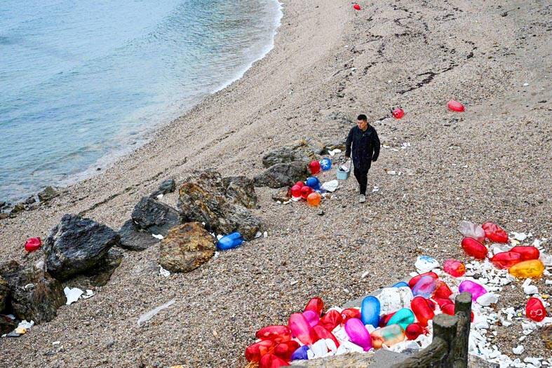As storm clouds gathered on a forgotten beach in China’s Miaodao islands, artist Fu Junsheng picked his way through piles of plastic waste washed up along the shoreline, looking for inspiration.