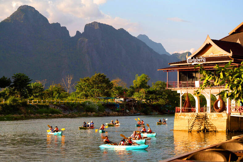 Today, the town attracts a much wider variety of tourists, and guests are drawn to more than just its party scene. In the crisp morning sunshine, tourists in kayaks splash along the waters of the river, the jagged mountains looming behind them. Stalls in the town offer excursions to the nearby blue lagoons and water caves, and hot air balloon trips above the surrounding rivers and rice paddies.