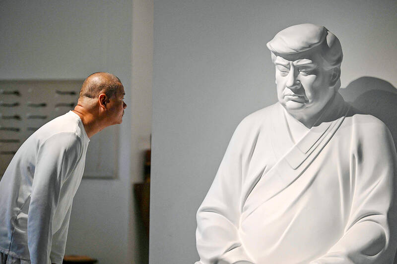Cross-legged with his eyes half-closed in a pose evoking the Buddha, this porcelain version of the divisive US leader-in-waiting is the work of designer and sculptor Hong Jinshi (洪金世).