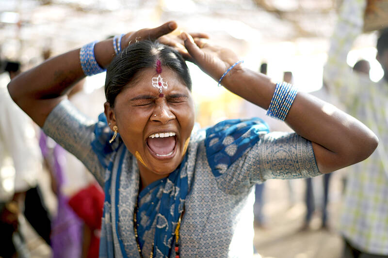 A woman wearing a holy mark on her forehead went into a trance shouting and swaying violently.