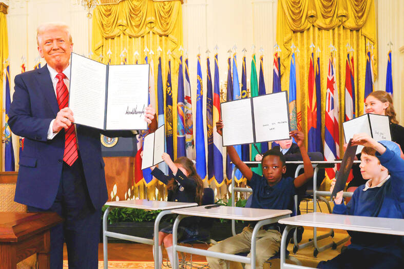 Surrounded by schoolchildren sitting at desks set up in the East Room of the White House, Trump smiled as held up the order after signing it at a special ceremony.