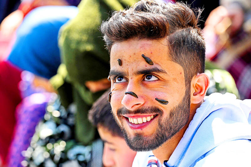Leeches suck blood from a man’s face during a leech therapy session on the banks of Dal Lake near Hazratbal Shrine in Srinagar in the Indian-administrated Kashmir on Friday. Leeches are often used to heal ailments, from blood circulation to skin care, in traditional medicine in Kashmir.