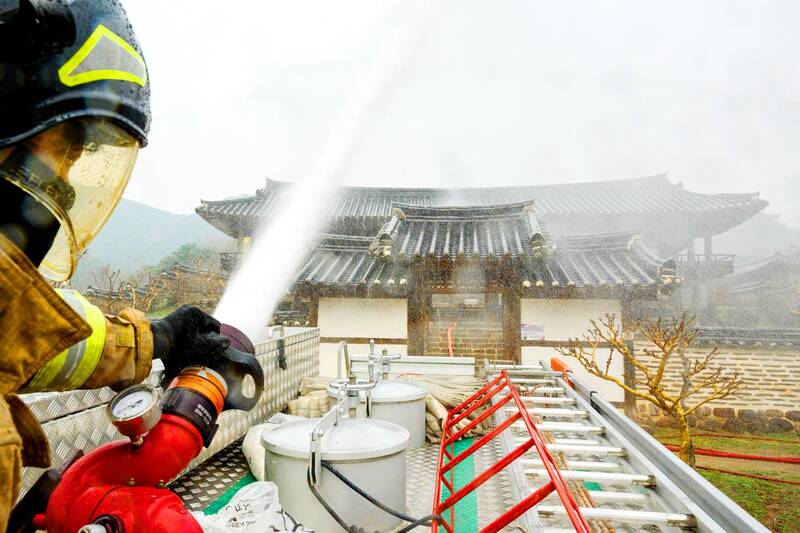 At UNESCO-listed Byeongsan Seowon, a former Confucian academy, the sky was hazy, with fire trucks spraying water and fire retardants onto the historic site in a desperate bid to save it.