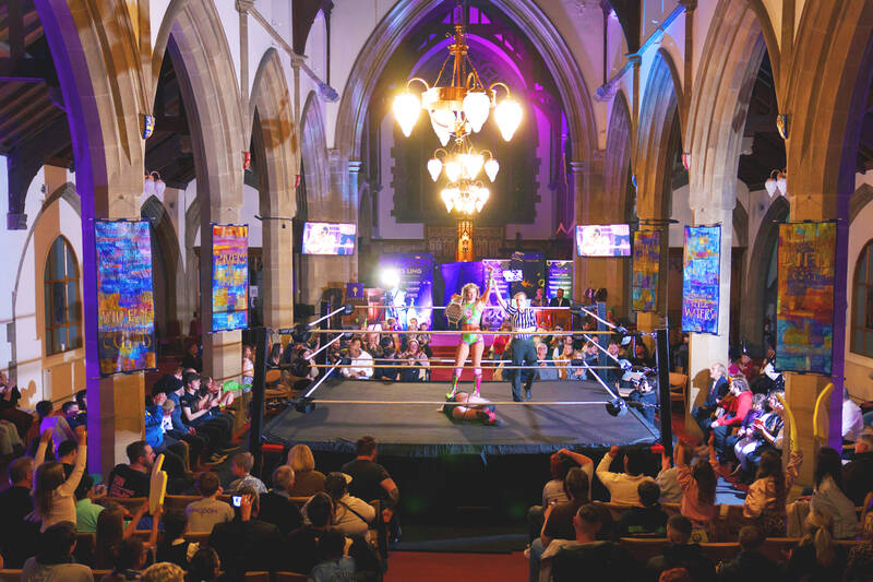 Sitting around a wrestling ring, churchgoers roared as local hero Billy O’Keeffe body-slammed a fighter named Disciple. Beneath stained-glass windows, they whooped and cheered as burly, tattooed wresters tumbled into the aisle during a six-man tag-team battle.