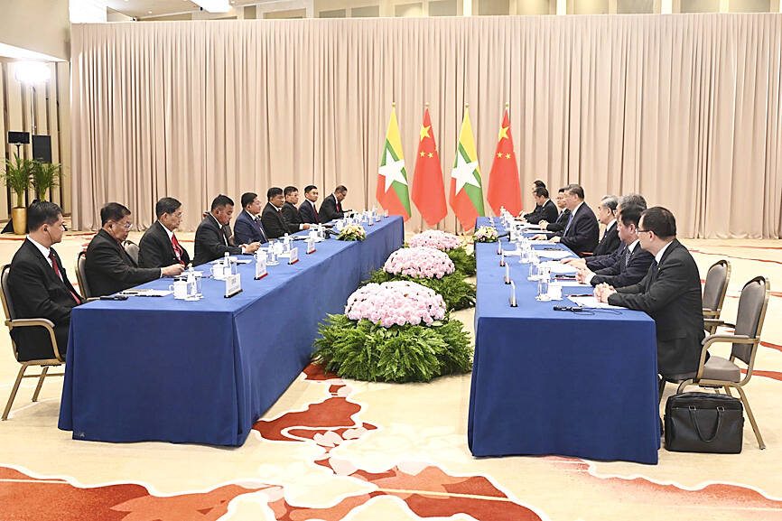 Myanmar’s junta chief met Chinese President Xi Jinping (習近平) for the first time since seizing power, state media reported yesterday, the highest-level meeting with a key ally for the internationally sanctioned military leader.