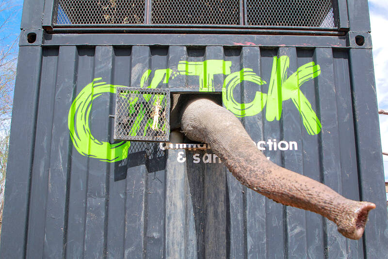 Two large containers and a huge crane were needed to load the elephants onto trailers.