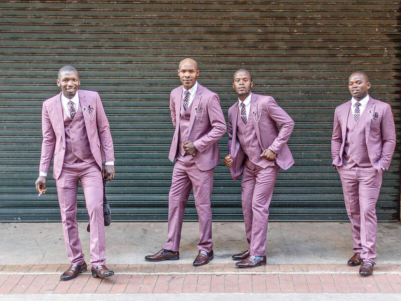 Members of a traditional Isicathamiya group pose for a photo outside the Natal Playhouse Theatre during an Isicathamiya concert in Durban, South Africa, on Saturday. The concert includes several groups showcasing the Isicathamiya style, an a capella choral singing style developed in South Africa by migrant Zulu communities.