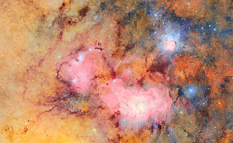 One of the debut images is a composite of 678 exposures taken over just seven hours, capturing the Trifid Nebula and the Lagoon Nebula — both several thousand light-years from Earth — glowing in vivid pinks against orange-red backdrops.