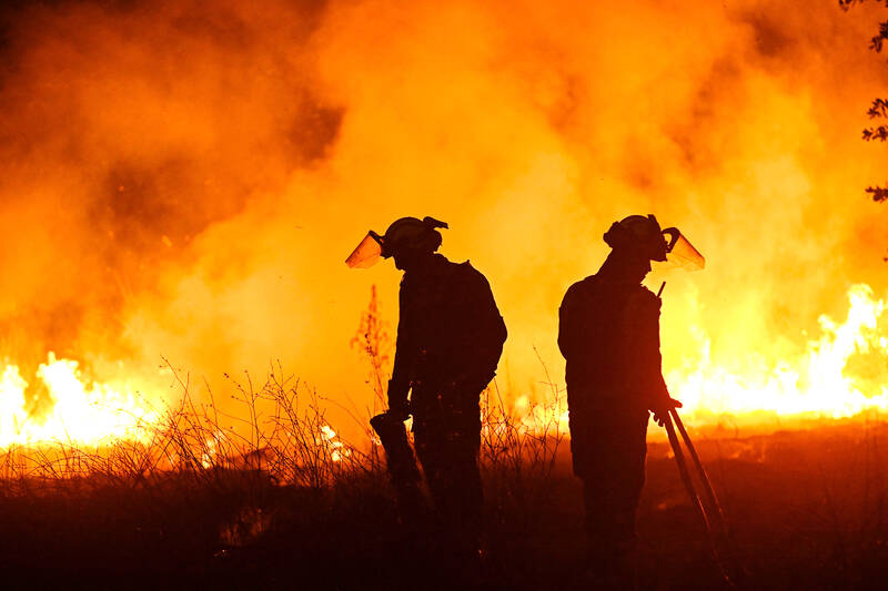 A firefighting volunteer died from severe burns, while several people were hospitalized as dozens of wildfires fueled by strong winds and scorching heat continued to rage across Spain yesterday, after three men and a child died and thousands were forced from their homes, as heat alerts were issued in Italy, France, Spain, Portugal and the Balkans.