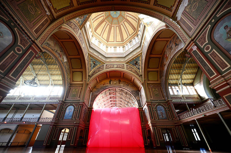 The exterior of “MATRIA,” an inflatable installation inside the Royal Exhibition Building, is pictured during a preview of Museums Victoria’s Now or Never festival in Melbourne yesterday. The installation creates “an immersive, pink-hued sanctuary” that envelopes “the vast interior in a translucent, monochromatic inflatable” and “reimagines the historic space as a living, breathing organism,” the organizer’s Web site says. Barcelona-based collective Penique Productions created “MATRIA,” inflating a mammoth balloon that absorbs the contours of the host space.