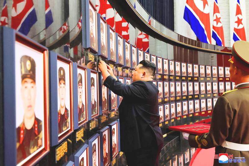 The images of an elaborate ceremony showed Kim presenting medals, placing them beside portraits of the fallen and consoling the returned soldiers, as Pyongyang’s leadership hailed the soldiers as “heroes” who sacrificed their youth and lives.
