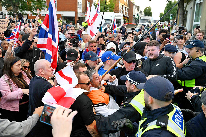 Police officers and protesters on Sunday scuffle outside the council offices in Epping, London, after a march from the Bell Hotel which houses asylum seekers. An appeals court on Friday last week overturned a lower court decision temporarily blocking the use of the protest-hit hotel to house asylum seekers.