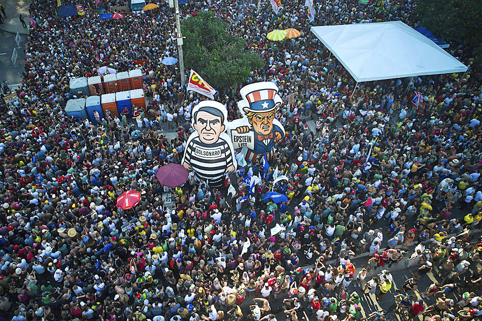 Crowds sang along as a blow-up doll of Bolsonaro wearing black-and-white prison stripes bobbed next to one of US President Donald Trump, who has punished Brazil with tariffs in retaliation for the prosecution of his ally.