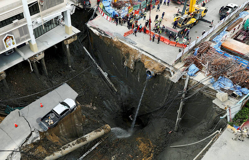 Bangkok Office of Disaster Prevention and Mitigation Director Suriyachai Rawiwan said at the scene that the collapse was likely linked to heavy rain and a leaky pipe.