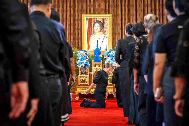 Hundreds of black-clad mourners also filed into the Grand Palace from yesterday morning, even before Sirikit’s remains arrived, paying tribute to ornate portraits depicting her.