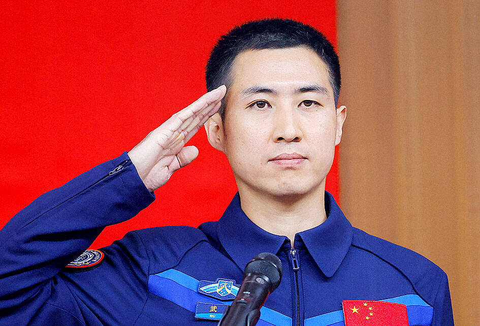 The crew for the nation’s next crewed flight to its space station would include its youngest astronaut to undertake a space mission, as well as four lab mice, authorities said yesterday. The Tiangong space station is crewed by teams of three astronauts that are exchanged every six months. The Shenzhou-21 mission is to blast off today at 11:44pm from the Jiuquan Satellite Launch Center, China Manned Space Agency spokesman Zhang Jingbo (張靜波) said. Flight engineer Wu Fei (武飛), who has just turned 32, is set to become the youngest Chinese astronaut to undertake a space mission, authorities said. “I feel incomparably lucky,” Wu told reporters. “Being able to integrate my personal dreams into the glorious journey of China’s space program is the greatest fortune this era has bestowed upon me.” He would be commanded by veteran space pilot Zhang Lu (張陸), 48, who took part in the Shenzhou-15 mission more than two years ago. Payload specialist Zhang Hongzhang (張洪章), 39, makes up the third member of the crew. Also along for the ride are four mice — two male and two female — which would be the subjects of the nation’s first in-orbit experiments on rodents, Zhang Jingbo said. Zhang Lu said he was confident his team would “report back to our motherland and its people with complete success.”