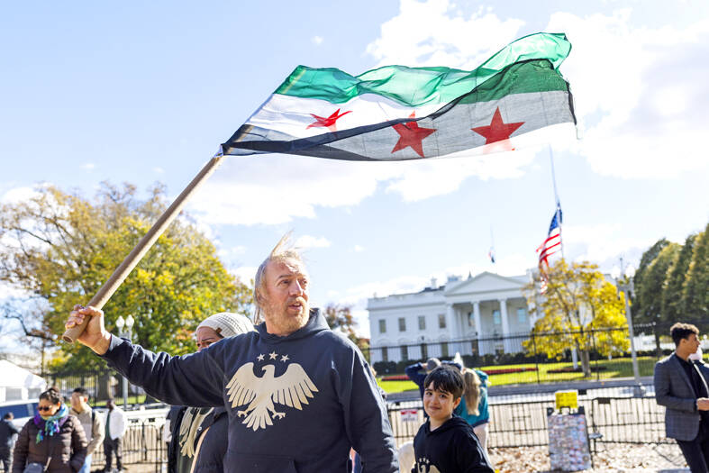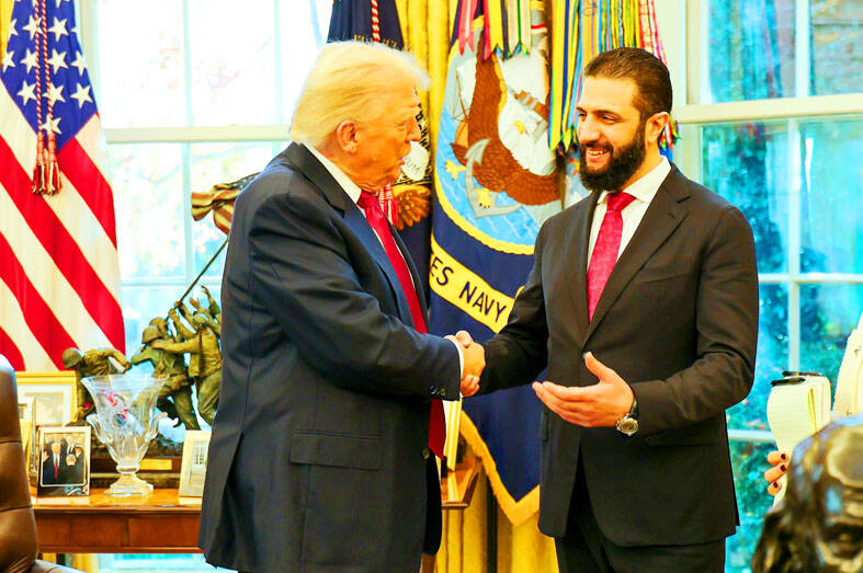 LANDMARK: After first meeting Trump in Riyadh in May, al-Sharaa’s visit to the White House today would be the first by a Syrian leader since the country’s independence Syrian President Ahmed al-Sharaa arrived in the US on Saturday for a landmark official visit, his country’s state news agency SANA reported, a day after Washington removed him from a terrorism blacklist. Sharaa, whose rebel forces ousted long-time former Syrian president Bashar al-Assad late last year, is due to meet US President Donald Trump at the White House today. It is the first such visit by a Syrian president since the country’s independence in 1946, according to analysts. The interim leader met Trump for the first time in Riyadh during the US president’s regional tour in May. US envoy to Syria Tom Barrack earlier