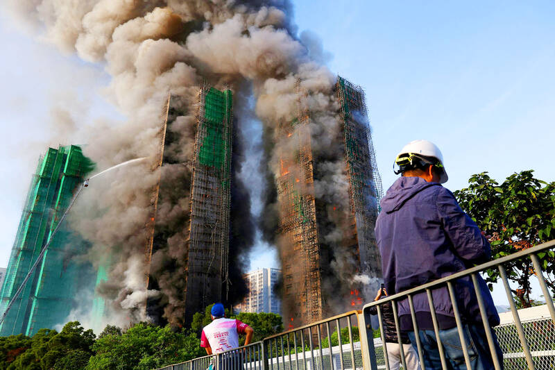 Emergency personnel work to extinguish flames engulfing bamboo scaffolding across multiple buildings at the Wang Fuk Court housing estate in Tai Po, Hong Kong, yesterday. Four people were reported to have been killed by the fire, authorities said. The cause of the blaze was not immediately clear.