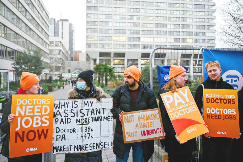 Doctors in England yesterday began a five-day strike over pay and working conditions during a surge in influenza cases and with no end in sight to an increasingly bitter dispute between the government and doctors’ union. The walkout is the latest in a series of strikes this year by “resident” or junior doctors, who make up nearly half the medical workforce and say their pay has been eroded over more than a decade. National Health Service England last week warned that hospitals were facing a “worst-case scenario” from a surge in cases of a virulent strain of flu.