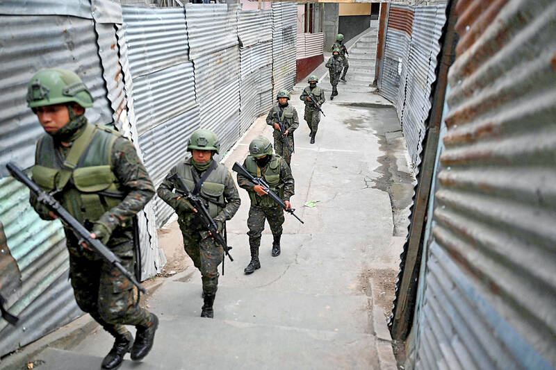 Guatemalan Army soldiers patrol a street of the Nueva Jerusalen neighborhood in Guatemala City on Tuesday. Guatemalan soldiers began patrolling gang-controlled neighborhoods in the capital after attacks over the weekend that left 10 police officers dead and prompted the government to declare a state of emergency.