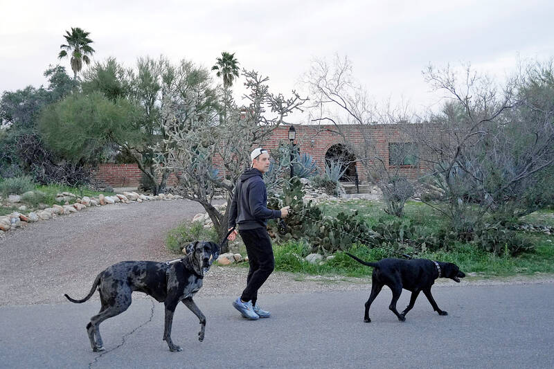 A man and his dogs pass Nancy Guthrie’s home in Tucson, Arizona, on Saturday. Guthrie, mother of “Today” show host Savannah Guthrie, is believed to have been kidnapped from her home the previous weekend. The television host on Saturday released a video on social media, in which she says the family is prepared to pay for the 84-year-old’s safe return.