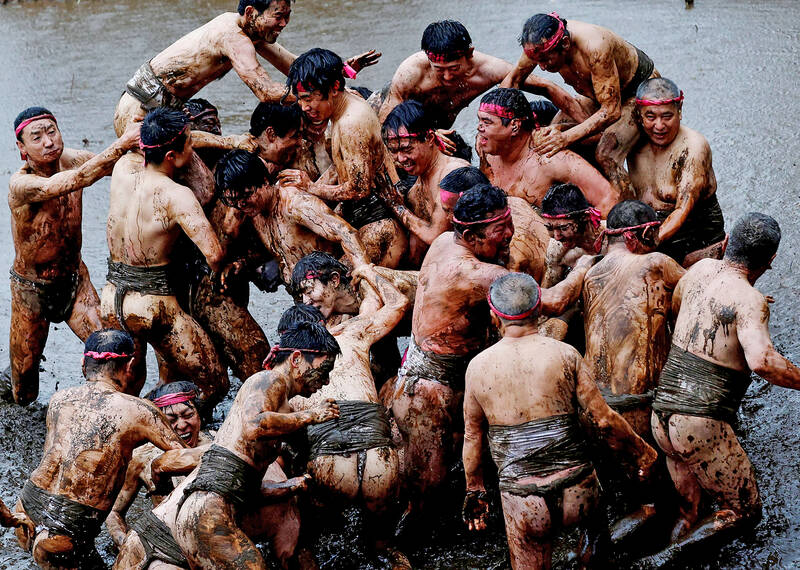 Men in loincloths wrestle in a mud field during Warabi Hadaka Matsuri (Warabi Naked Festival), also dubbed the “Doronko Matsuri” (“muddy festival”), in Yotsukaido, Japan, yesterday. The festival, which has about 200 years of history, is held in hopes of a bountiful harvest, organizers said.
