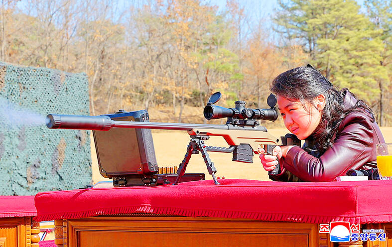 Pyongyang’s official Korean Central News Agency (KCNA) released a photo of Ju-ae shooting a rifle at an outdoor shooting range, peering through a rifle scope with her finger on the trigger, smoke rising from the barrel.