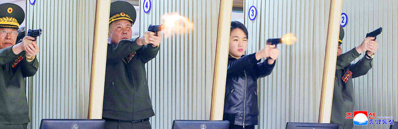 The government yesterday released an image of leader Kim Jong-un’s teenage daughter, Kim Ju-ae, firing a pistol, weeks after photographs showed her shooting a rifle — once again stoking speculation she is being groomed as heir. State media images showed the duo, donning matching leather jackets — often seen as a symbol of power in the country — at a “major munitions factory” being briefed by officials as they inspected the facility. Despite her young age, “it appears the regime is trying to cultivate the image of a strong and formidable woman,” said Lim Eul-chul, a North Korea expert at South Korea’s Kyungnam University. “The pistol-shooting scene clearly serves to signal that she is cultivating the attributes of a military leader.”