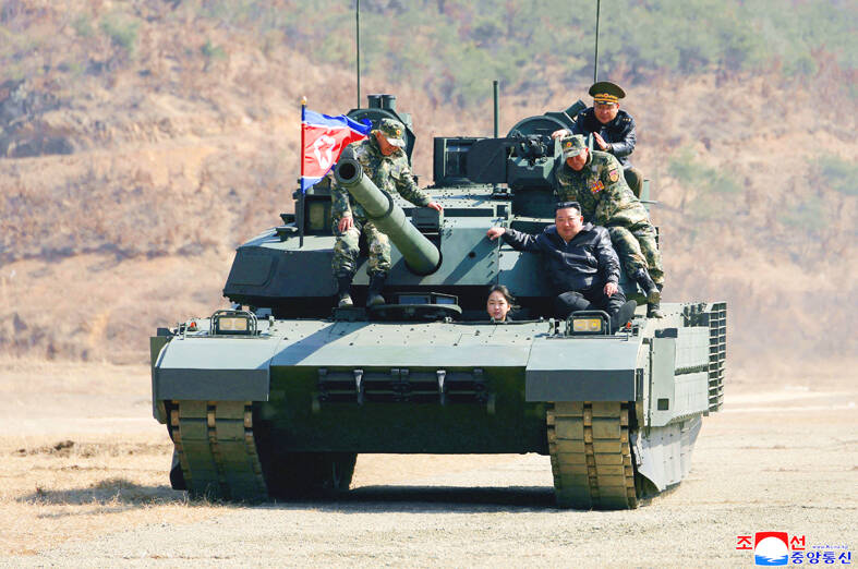 North Korean leader Kim Jong-un and daughter Kim Ju-ae tried out the country’s new battle tank in large-scale military drills, state media reported yesterday, in the latest sign that she was being groomed as his heir.