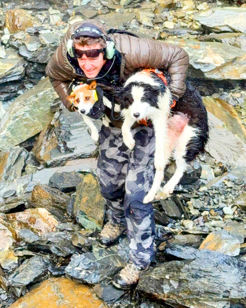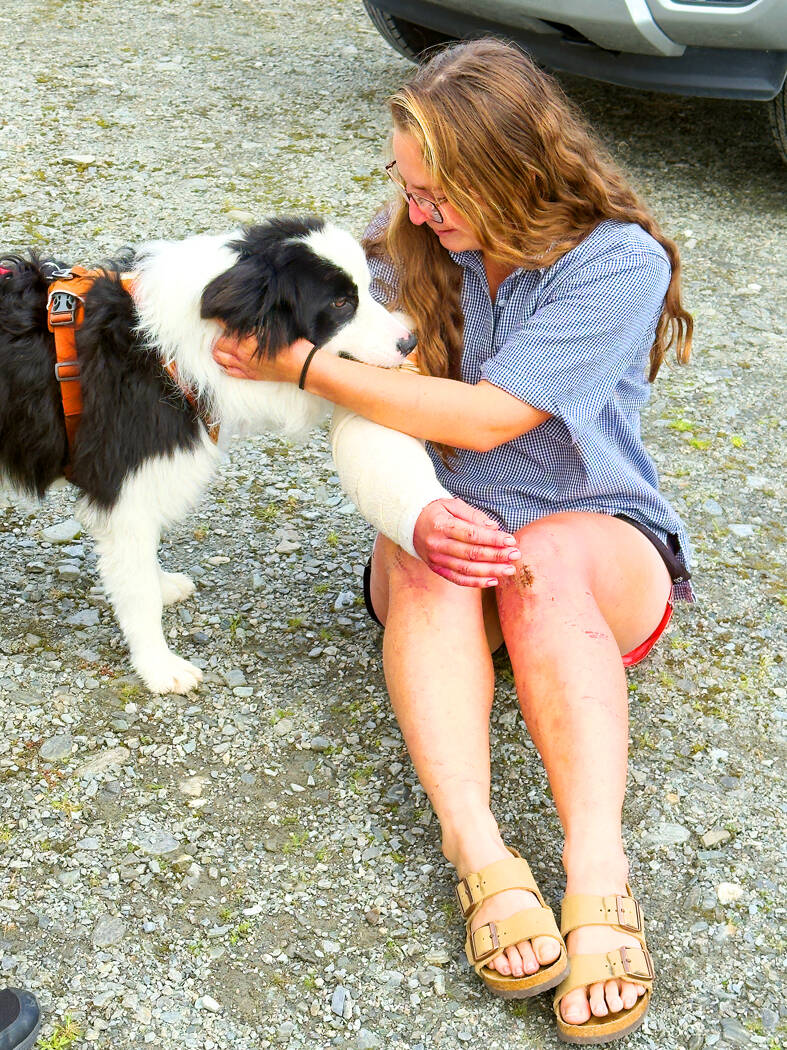 Hours after the dog’s rescue, her owner, still battered from her fall, arrived for a tearful reunion.