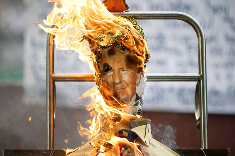 An image of US President Donald Trump appears during the Burning of Judas folk tradition in Caracas on Sunday. Rag dolls representing indifference, the mistreatment of political prisoners in Venezuela and Trump were burnt as part of the popular custom.