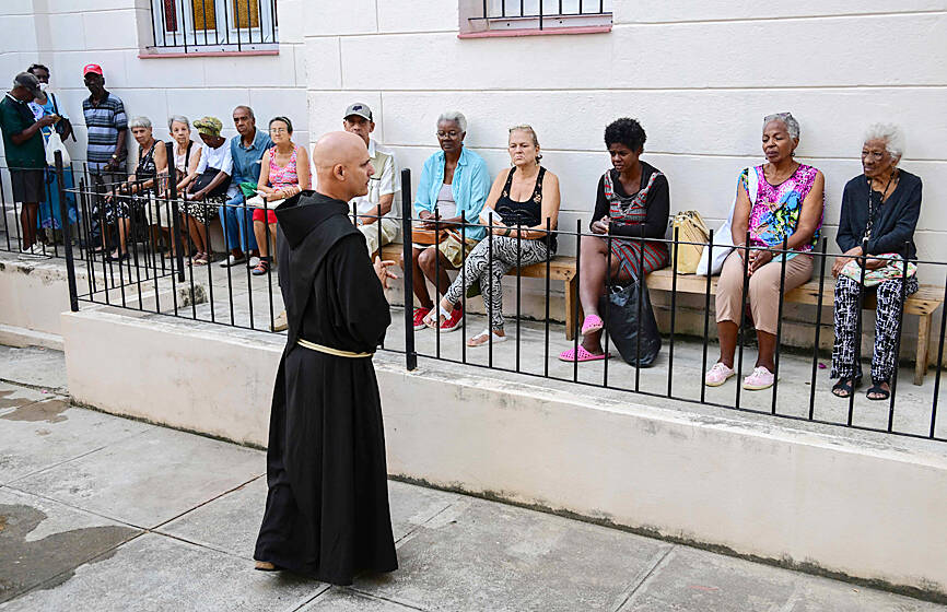 Dozens of people queue outside the Church of the Holy Cross of Jerusalem in Havana twice a week for free medicine, which, like food and electricity, is in short supply on the island.