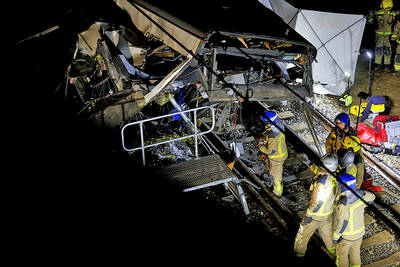 A commuter train near Barcelona on Tuesday ploughed into the rubble of a collapsed wall, killing one and injuring dozens in Spain’s second deadly rail accident in days.The latest incident is likely to raise more questions about Spanish transport safety, coming two days after the collision of two hig