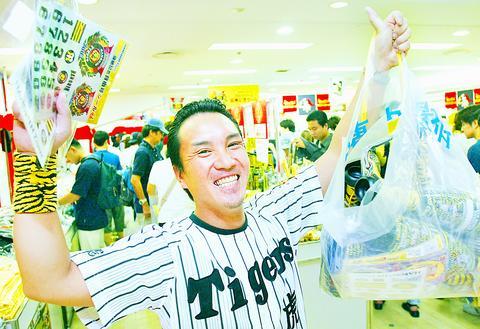 Makinori Sugimoto, wearing a Tigers uniform and a Tigers bandana, emerged from the store with a bag full of memorial bull-horns, towels, plaques and signature sheets, worth ¥20,000.