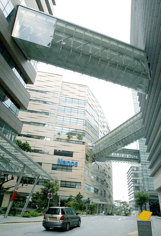 In buildings named Matrix, Centros, Nanos, Genome, Helios, Chromos and Proteos interlinked by pedestrian skyways, scientists in laboratory coats and jeans work in meticulously planned surroundings at the Biopolis.