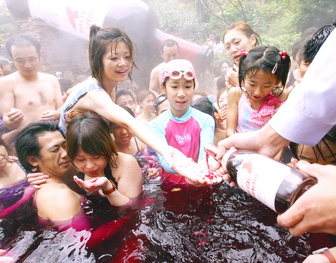 A hot spring spa resort in Hakone, a resort region near Japan's celebrated Mount Fuji, is pouring the fruity red wine into one of its pools until Sunday to celebrate the release of this year's product.