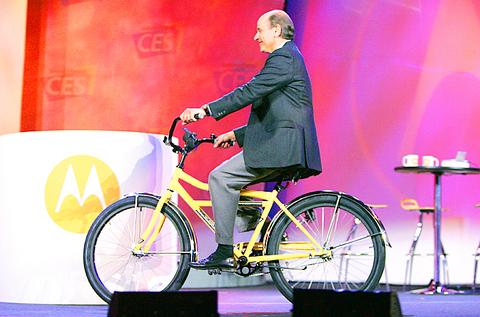 Motorola Inc chief executive Ed Zander rode onto the stage on Monday at the International Consumer Electronics Show astride a yellow bicycle, joking that he pedaled all the way from Chicago because his company was on "expense controls."