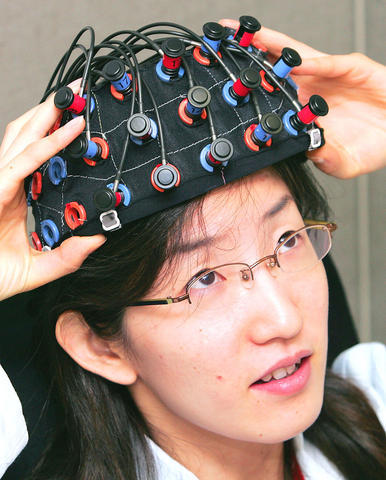 A cap connects by optical fibers to a mapping device, which links, in turn, to a toy train set via a control computer and motor during one recent demonstration at Hitachi's Advanced Research Laboratory in Hatoyama, just outside Tokyo.